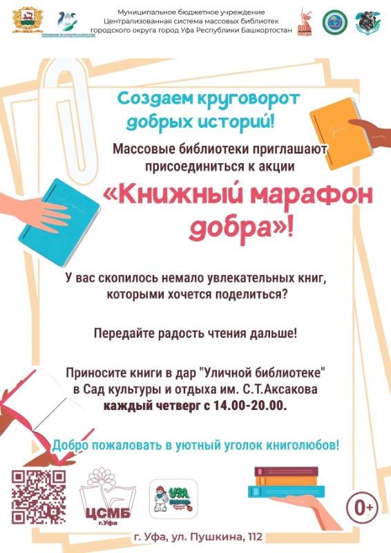 Принести книги можно каждый четверг с 14:00 до 20:00 часов в «Читальный дом» Сада культуры и отдыха им. С. Т. Аксакова.
