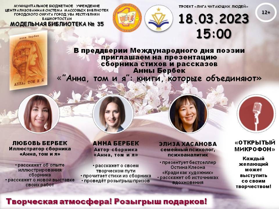 В преддверии Всемирного дня поэзии, 18 марта, в модельной библиотеке № 35 состоится «слёт творцов»! Основной частью мероприятия станет презентация сборника стихов и рассказов «Анна, том и я» Анны Бербек! Автор расскажет о своём творческом пути и прочитает стихи из своей книги. В этот день в формате «Открытого микрофона» свои стихи и прозу представят публике и другие творческие демчане!