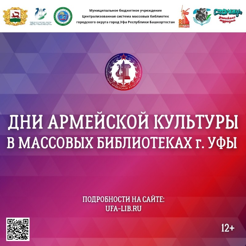 В рамках федерального проекта «Дни армейской культуры», который проводится Министерством обороны России, с 22 по 27 августа 2025 года массовые библиотеки г. Уфы проведут множество встреч под девизом «Армия. Культура. Единство». Присоединяйтесь к событиям!
