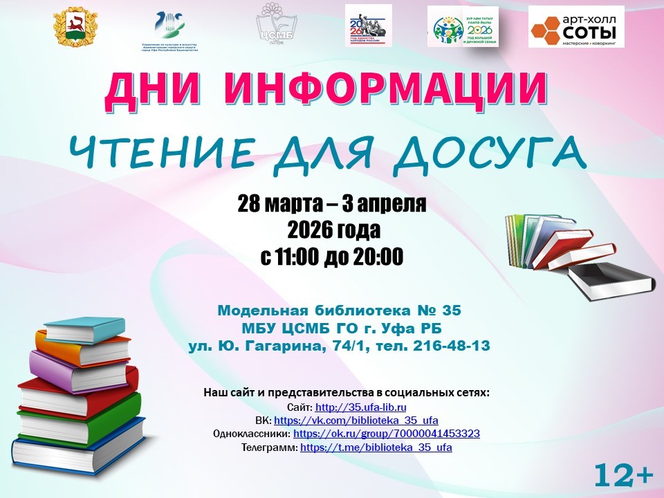 С 28 марта по 3 апреля 2026 года в модельной библиотеке № 35 г. Уфы пройдут Дни информации «Чтение для досуга», предлагающие знакомство с художественной и детской литературой из фонда библиотеки.