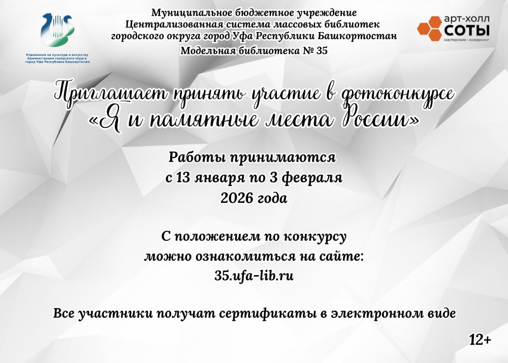 Именно для таких туристов-любителей модельная библиотека № 35 МБУ Централизованная система массовых библиотек ГО г. Уфа РБ запускает фотоконкурс «Я и памятные места России», который пройдет с 13 января по 17 февраля 2026 года. Его участником может стать любой желающий от 12 лет и старше.