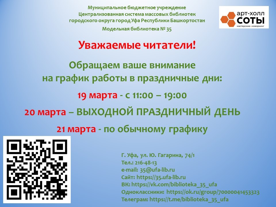 19 марта - с 11:00 до 19:0020 марта - выходной праздничный день21 марта - по обычному графику с 11:00 до 20:00