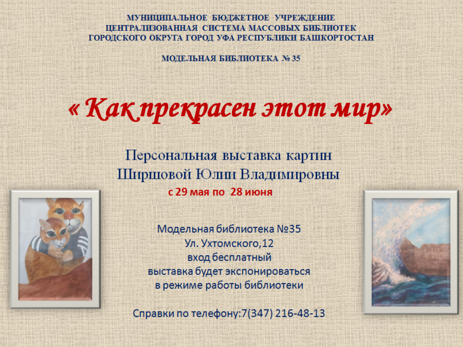 Модельная библиотека № 35 МБУ ЦСМБ ГО г. Уфа РБ приглашает посетить выставку картин Ширшовой Юлии Владимировны «Как прекрасен этот мир» Выставка работает с 29 мая - 28 июня в режиме работы библиотеки