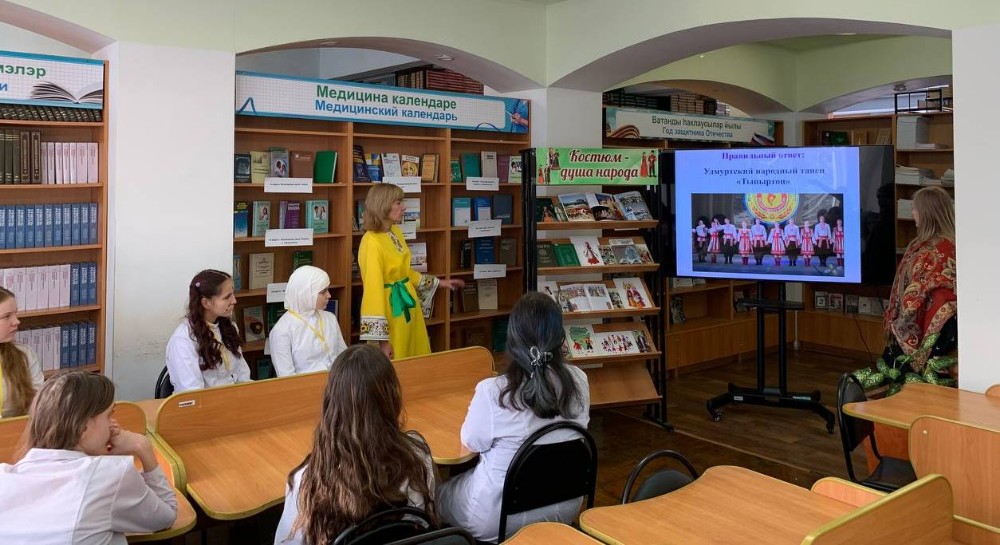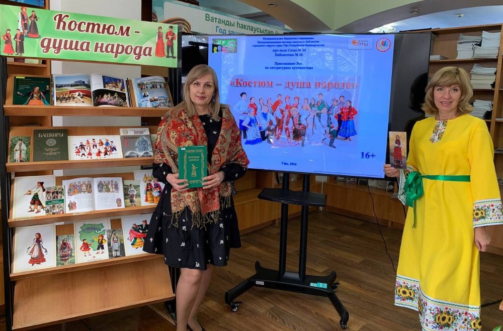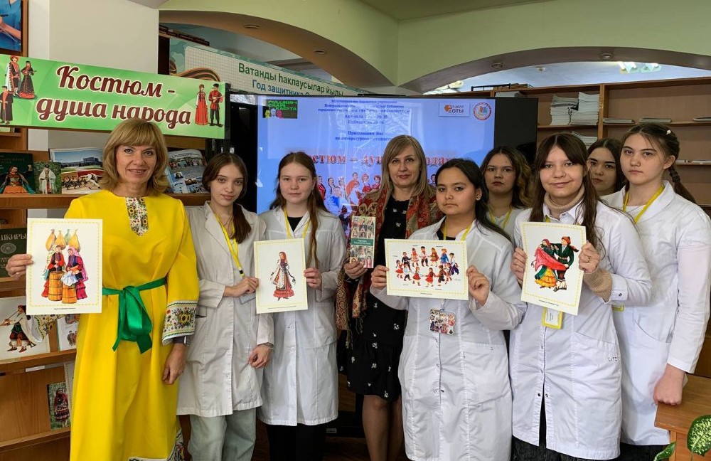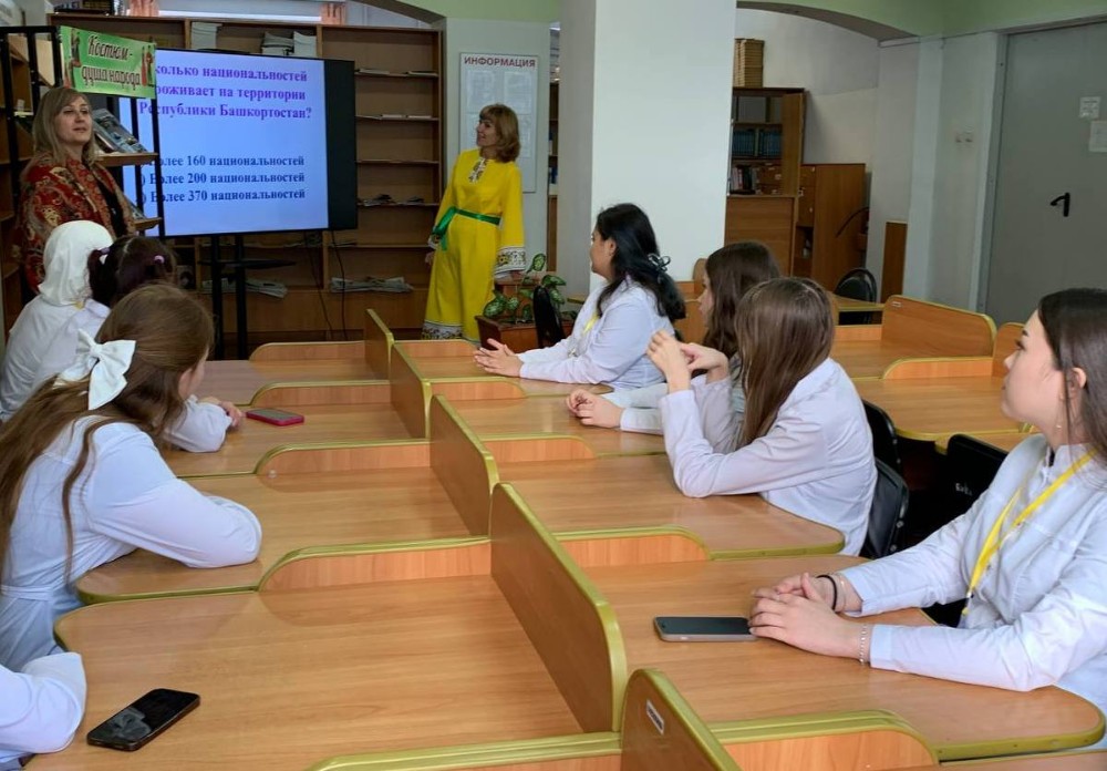 Студентам было представлено литературно-музыкальное путешествие в сопровождении электронной презентации «Многонациональный Башкортостан», состоящей из нескольких блоков-вопросов по культуре и национальному костюму республик Поволжья: Башкортостана, Татарстана, Удмуртии, Мари Эл, Чувашии, Мордовии, а также народов – ближайших соседей России: Беларуси.