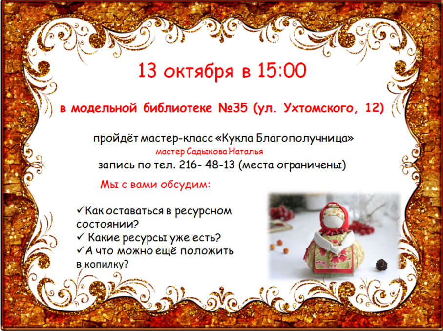 Психолог Садыкова Наталья покажет мастер - класс по созданию обережной куклы и даст совет как улучшить и поддержать свое настроение.