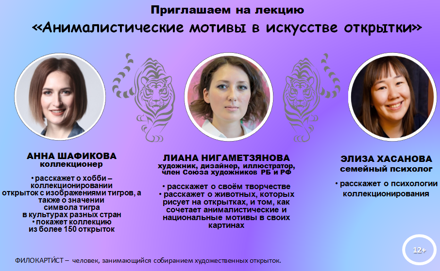Коллекционер открыток Анна Шафикова рассказала публике, почему стала собирать именно открытки и именно с изображением тигров. В её коллекции более 150 открыток – как покупных, так и дизайнерских, уникальных в своём роде. Среди открыток работы уфимских художников и дизайнеров: Лианы Нигаметзяновой, Екатерины Клименко, Аллена Еникеева, Любови Бербек, Екатерины Качинской, Гузель Загировой, Натальи Пичшевой, Анастасии Майковой, Жозефины Уолл и др.