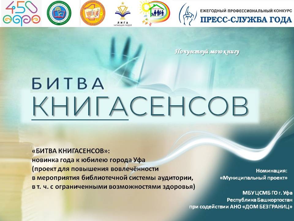 Проект «БИТВА КНИГАСЕНСОВ» поддерживает Год семьи и Год заботы о людях с ограниченными возможностями здоровья, объявленный в нашей Республике! Его цель – повышение вовлечённости аудитории в мероприятия библиотеки в условиях виртуализации культурно-досуговой деятельности. И что важно, мероприятия БИТВЫ КНИГАСЕНСОВ могут быть реализованы как муниципальными библиотеками, так и библиотеками вузов и школ, а также книжными клубами. В этом году проект был реализован в четырёх форматах – очно на базе библиотеки № 35, онлайн в соцсети «ВКонтакте», в виде выездного мероприятия библиотеки № 35 и в инклюзивном онлайн-формате с участием детей с ОВЗ (АНО «ДОМ БЕЗ ГРАНИЦ»).