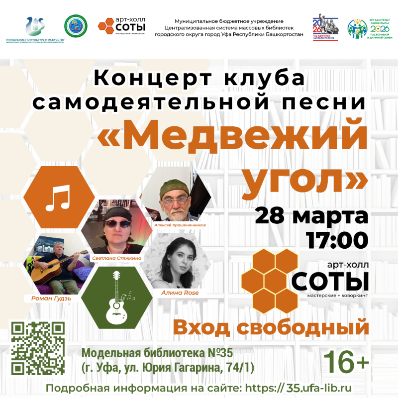 28 марта 2026 года модельная библиотека № 35 Арт-холл «Соты» (ул. Ю. Гагарина, 74/1) приглашает всех желающих посетить концерт клуба самодеятельной песни «Медвежий угол».