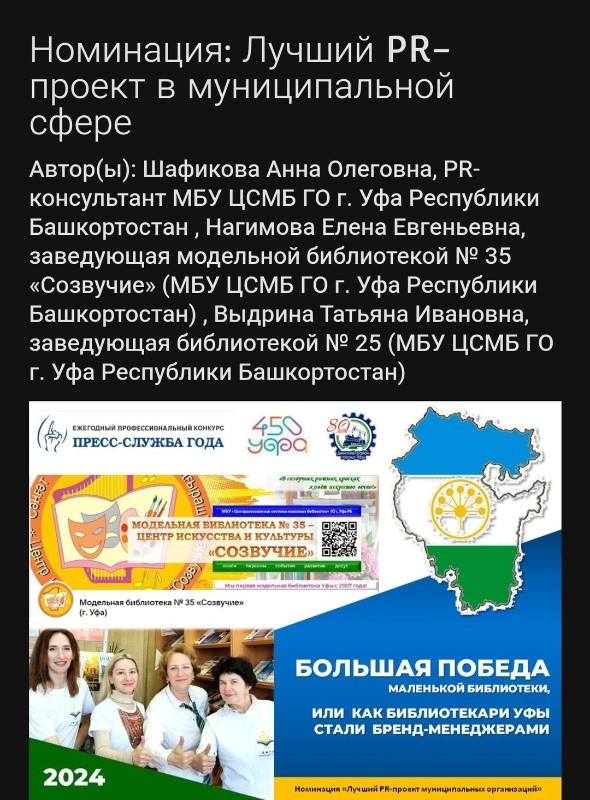 Проект библиотечной системы Уфы, реализованный в нашей библиотеке, принёс диплом «Отличник года» авторам – Анне Шафиковой, Елене Нагимовой и Татьяне Выдриной!