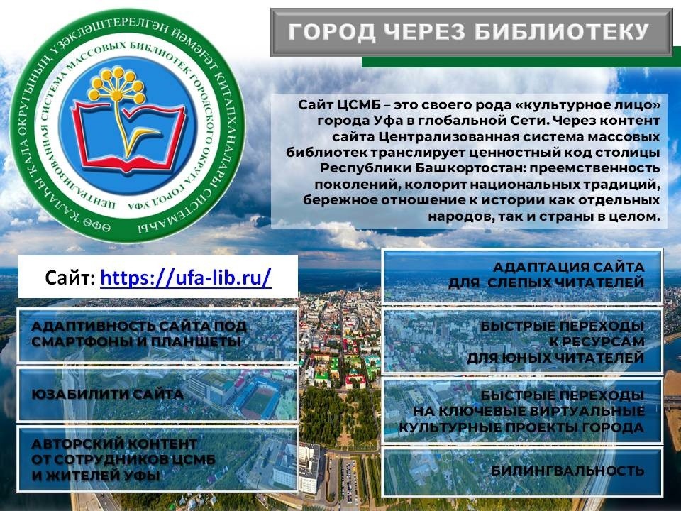 Проект включает в себя презентацию концепции и структуры сайта, портрет читателей, результатов работы ресурса за 9 месяцев текущего года, технический аудит сайта, но главное – оценку вклада нашей библиотечной системы в формирование урбанистической самоидентификации жителей Уфы. Главная мысль проекта – наш сайт является элементом PR-продвижения территории (город Уфа) через трансляцию населению приоритетных социокультурных ценностей, патриотическое воспитание и двустороннюю билингвальную (русский и башкирский языки) коммуникацию, доступность для слабовидящих. Экспертам мы предоставили отличительные особенности визуальных элементов и содержания сайта от сайтов аналогичных учреждений культуры. И нам было что показать! Наш сайт в этом году отмечает 10-летний юбилей: его модераторы Ольга Маркелова, Ренат Гареев и Дарья Рыцева проделали большую работу, и впереди, в преддверии 450-летия города Уфа, коллектив ждут новые творческие задачи.