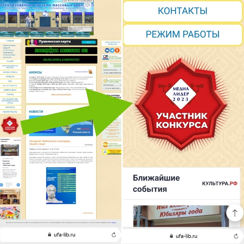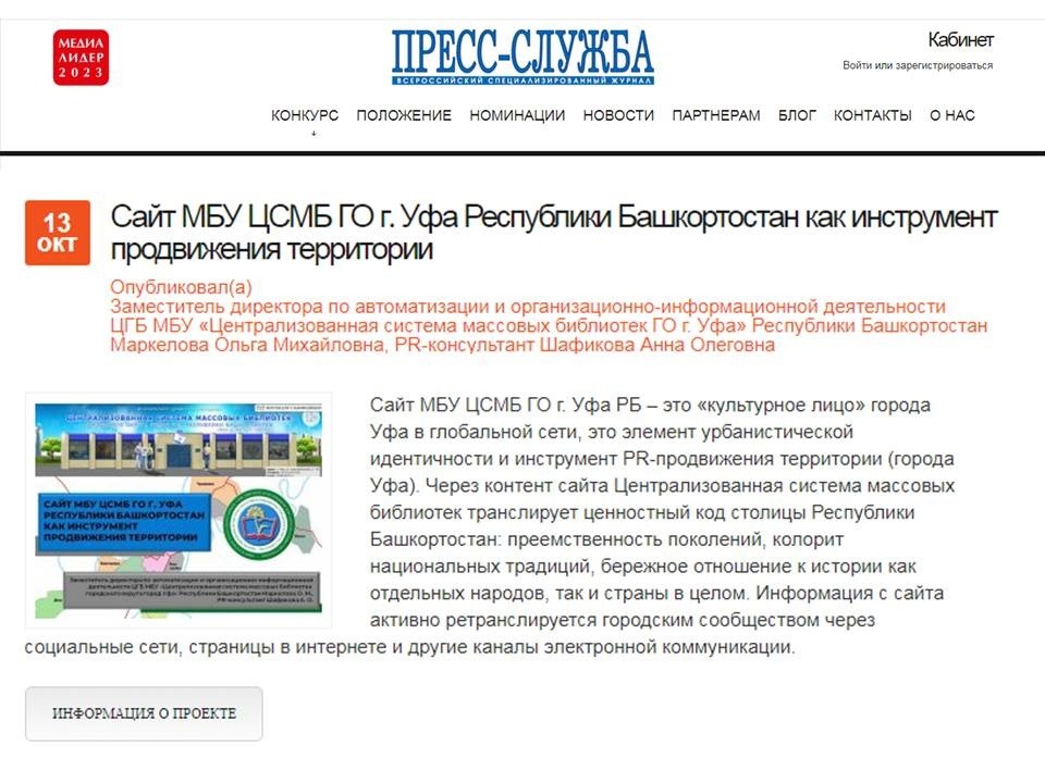 Читатели обратили внимание, что на нашем сайте появился яркий значок «Участник конкурса МЕДИАЛИДЕР – 2023». В октябре Централизованная система массовых библиотек Уфы приняла впервые участие в международном конкурсе «МЕДИАЛИДЕР – 2023». Всего в этом году в 18 номинациях было представлено 408 проектов российских и зарубежных организаций. В номинации «Лучший сайт государственной/муниципальной структуры» мы представили на суд экспертам медиасферы проект «Сайт МБУ ЦСМБ ГО г. Уфа Республики Башкортостан как инструмент продвижения территории» (ссылка на описание проекта).