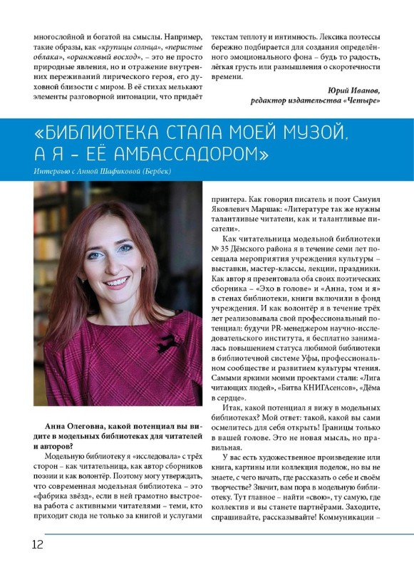 В питерском журнале «ВРЕМЯ ЧИТАТЬ» вышло интервью с волонтёром нашей библиотеки – PR-консультантом Анной Шафиковой, где упоминаются наши самые яркие культурные проекты последних лет!