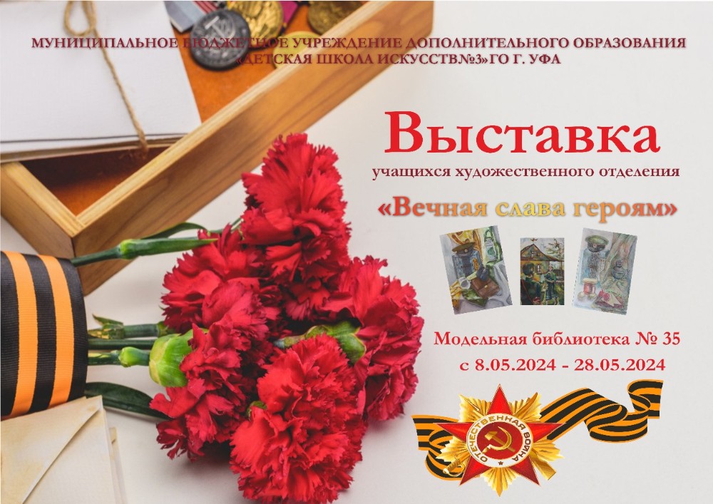 В модельной библиотеке №35 открылась выставка детских рисунков «Вечная слава героям» с 8.05.2024 по 28.05.2024г, посвященная Дню Победы. Выставка формирует у детей представление о подвиге народа, который встал на защиту своей Родины в годы Великой отечественной войне, а так же воспитание, гордость и уважение к Родине и ее защитникам. Работы выполнены разными материалами такими красками как акварель, гуашь и мягкими материалами учащимися художественного отделения Детской школы искусств №3: