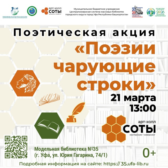 21 марта 2026 года, во Всемирный день поэзии, Модельная библиотека № 35 Арт-холл «Соты» (ул. Ю. Гагарина, 74/1) приглашает всех желающих принять участие в поэтической акции «Поэзии чарующие строки».