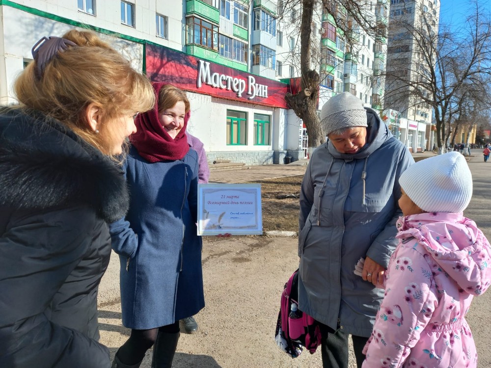 Библиотекари поздравляли горожан с праздником и предлагали вспомнить любимые поэтические строчки. Многие демчане экспромтом читали русских поэтов - Александра Пушкина, Юрия Лермонтова, Николая Некрасова…Некоторые прохожие с удовольствием брали в руки предложенные библиотекарями томики стихов и зачитывали произведения уже из них.