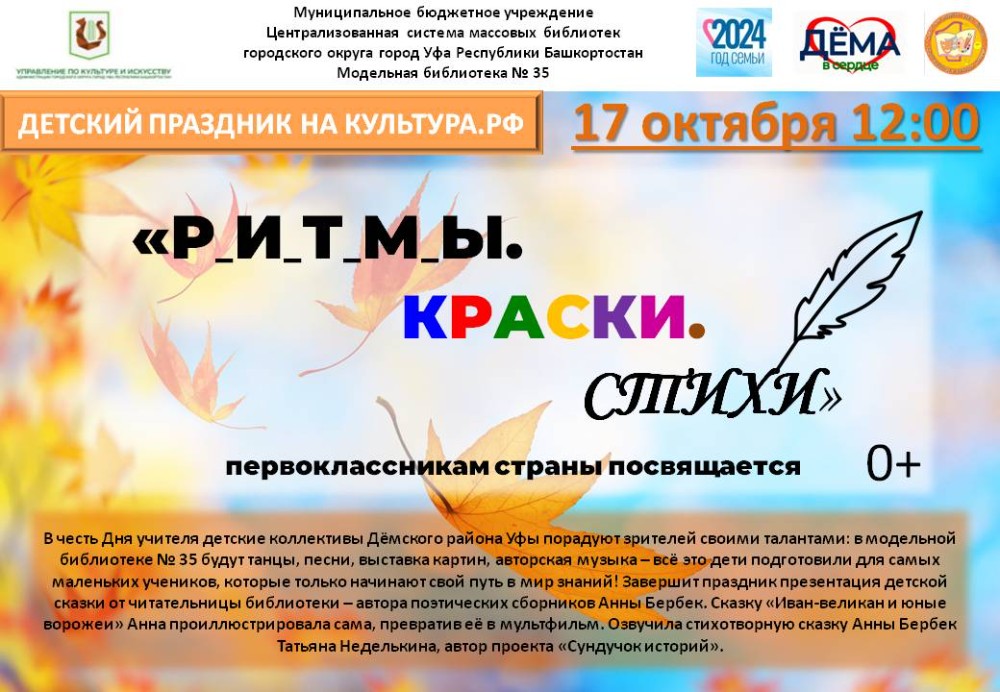 Праздничная программа «РИТМЫ. КРАСКИ. СТИХИ» уфимская модельная библиотека № 35 при участии авторов проекта «Дёма в сердце» представляет праздничную онлайн-программу «РИТМЫ. КРАСКИ. СТИХИ», посвящённую первоклассникам страны!