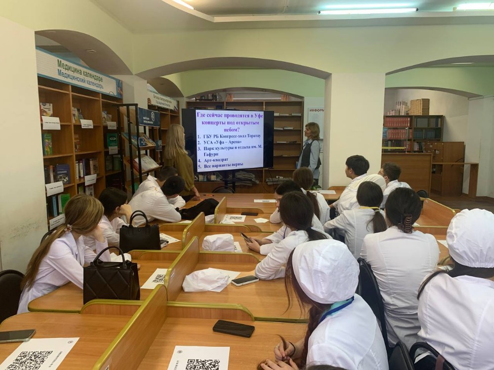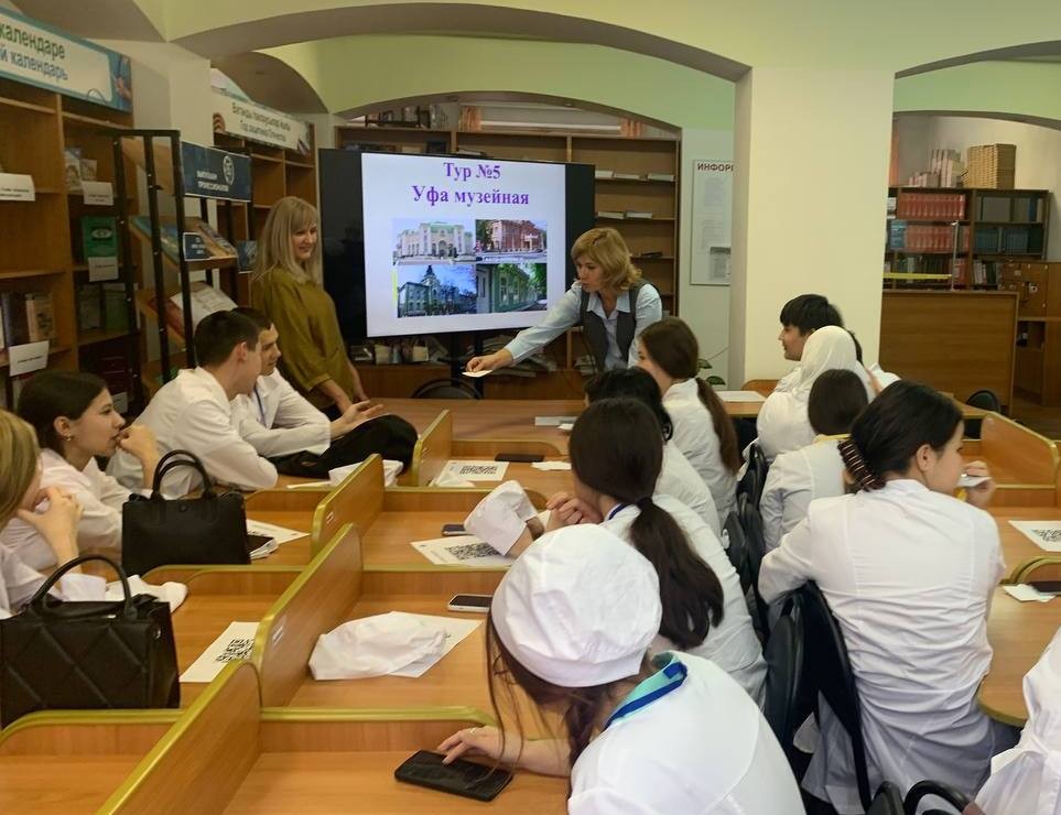 Представленный студентам экскурс в виде электронной презентации содержал в себе 6 туров: Уфа библиотечная, Уфа историческая, Уфа современная, Уфа литературная, Уфа музейная и Уфа музыкально-театральная.