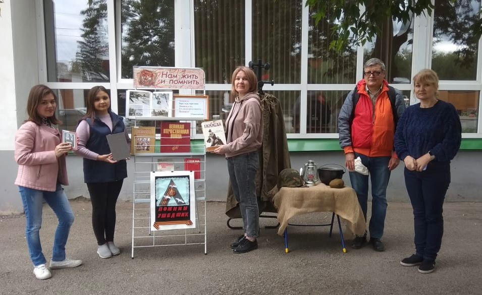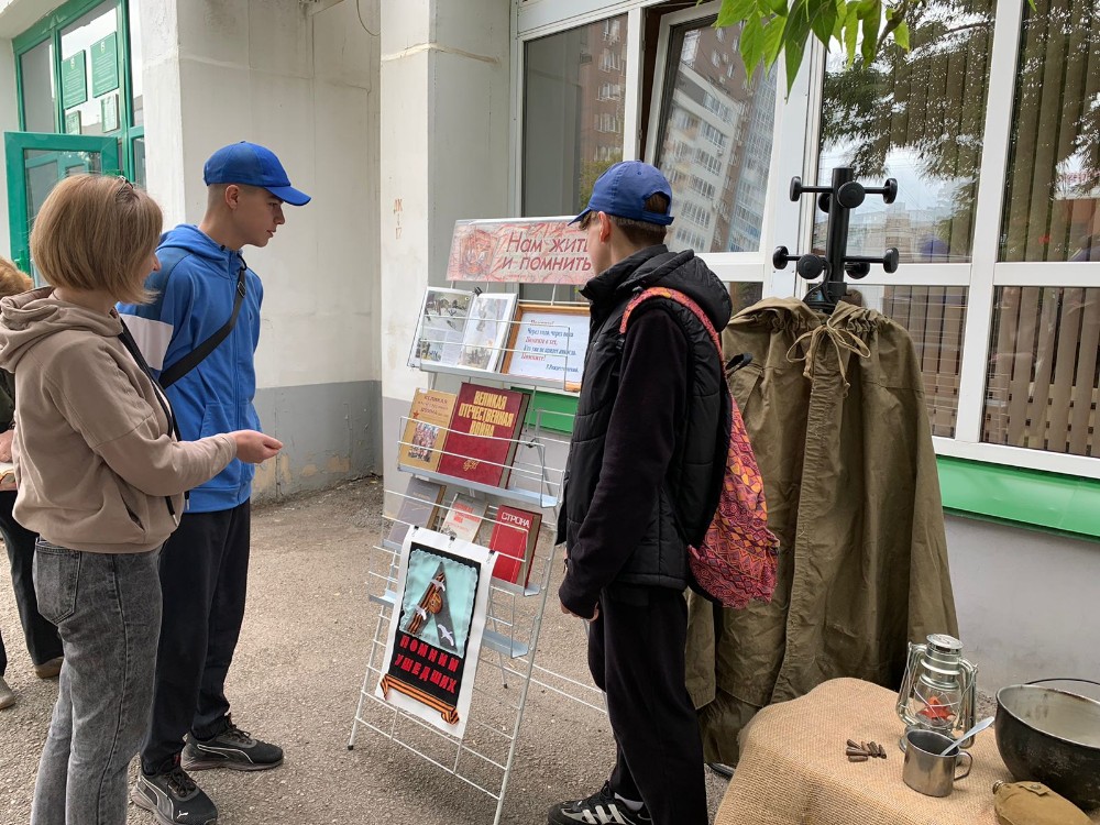 В рамках Дня памяти и скорби библиотеки Дёмского района № 13, № 25 и № 35 провели на улице Ухтомского час памяти «Мы этот день запомним навсегда». Центром мероприятия стала выставка – инсталляция «Нам жить и помнить». На ней была представлена документальная и художественная литература, рассказывающая о значимых событиях Великой Отечественной войны, а так же военная атрибутика: военная каска, фляжка, кружка, котелок…