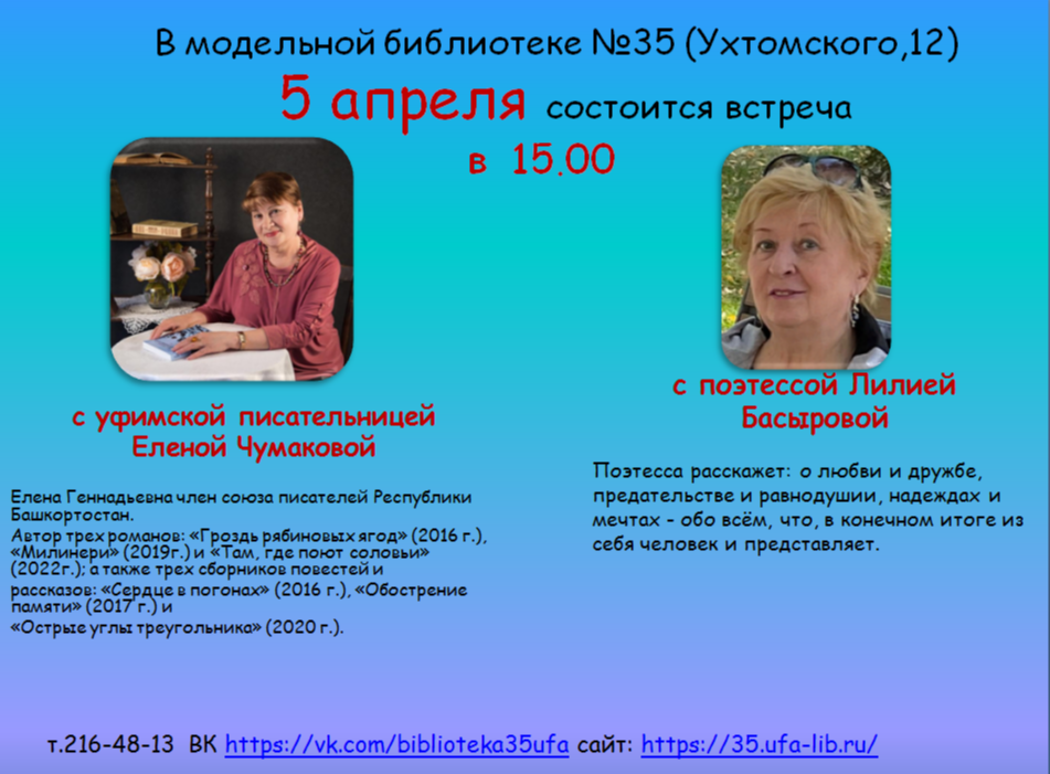 5 апреля в 15.00 в модельной библиотеке №35 пройдет творческая встреча с Еленой Чумаковой и Лилией Басыровой.